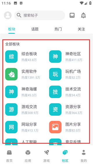 4、切换到社区页面,能看到【综合板块】【实用软件】等分类板块,点击对应板块可进入交流区域哦。