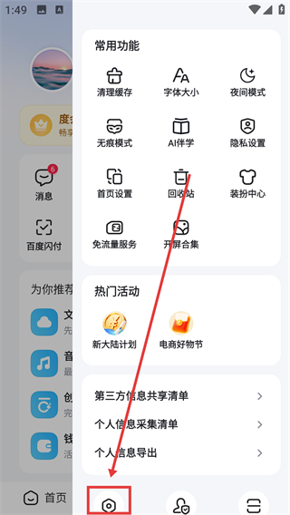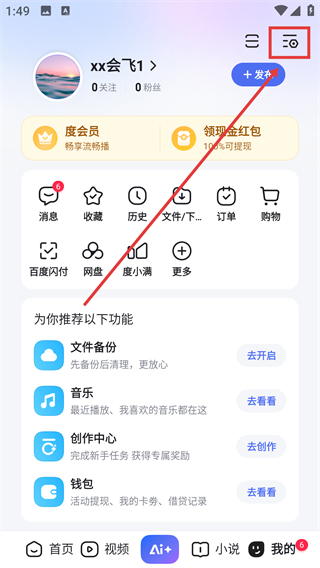1、在百度APP的“我的”页面,点击右上角的功能菜单图标,就能展开功能列表,找到设置相关入口啦。