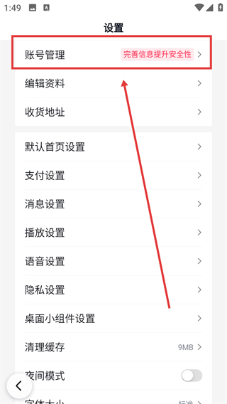 3、进入设置界面后,点击【账号管理】选项,即可跳转至账号管理页面,处理账号相关的各项设置呀。