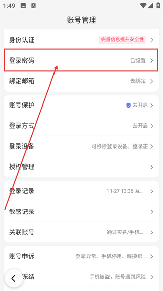4、在账号管理页面,点击【登录密码】选项,可进入密码管理界面,进行密码的修改或重置操作啦。