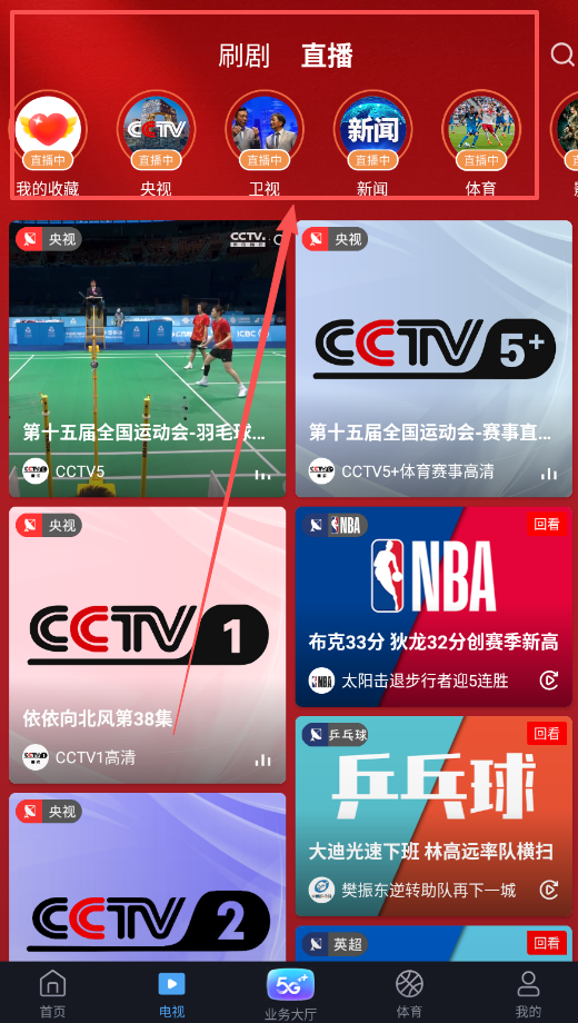 3、进入电视板块后,顶部有刷剧和直播选项,点击直播就能看到央视,卫视,新闻等各类直播频道。
