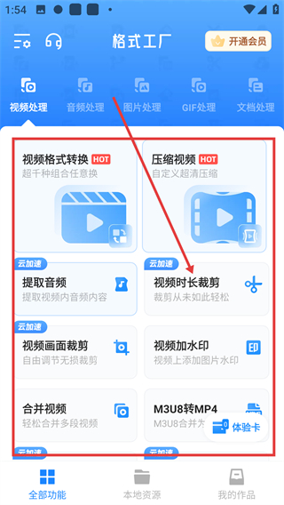 1、在格式工厂首页,点击【视频时长裁剪】选项,就能进入视频裁剪的编辑界面啦。