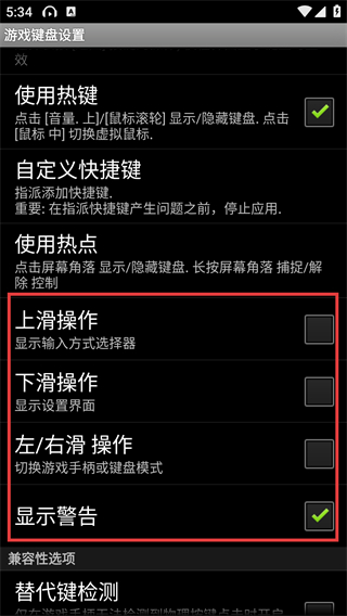 4、返回设置页面后,红框区域可配置【上滑操作】【下滑操作】【左/右滑操作】【显示警告】滑动相关操作选项。