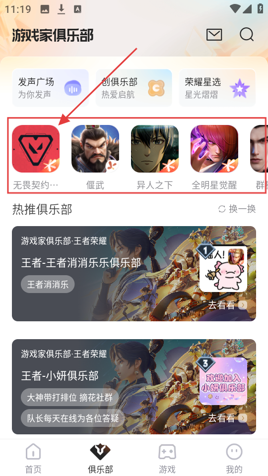 1、在软件首页,能看到底部的【俱乐部】选项,点击它就能进入游戏家俱乐部页面,去探索各类俱乐部啦。
