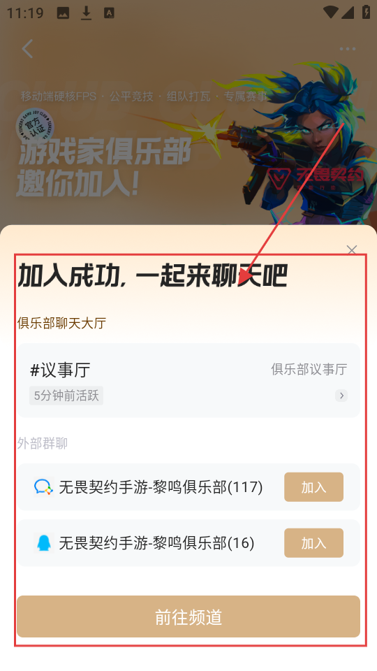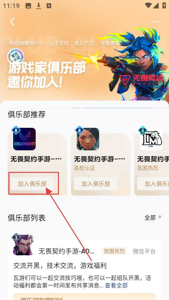 3、进入心仪的俱乐部页面,比如无畏契约相关俱乐部,看到【加入俱乐部】按钮,点击它就能申请加入啦。