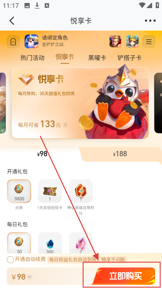 2、进入悦享卡页面后,能看到不同价位的悦享卡,选好后点击【立即购买】按钮,就可以进入购买流程啦。