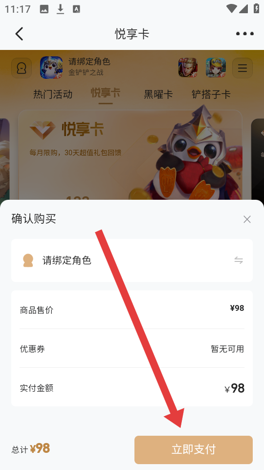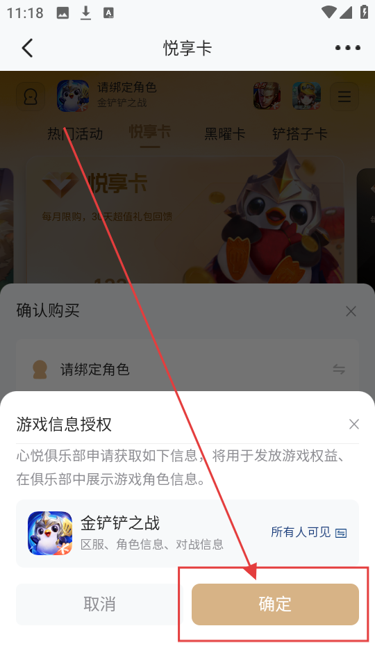 4、支付前,若有游戏信息授权提示,比如【金铲铲之战】的信息授权,点击【确定】按钮,就能完成授权,继续购买流程啦。
