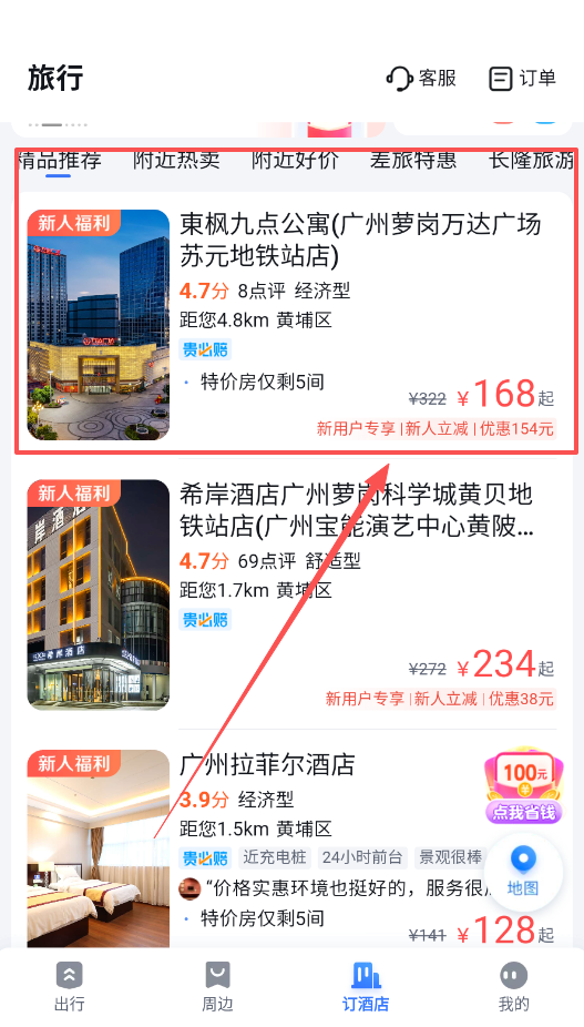 4、预订酒店时,进入旅行板块选择房型并设置日期与价格筛选。记得领取新人基金和周五优惠券以抵扣房费,并使用地图工具辅助决策。
