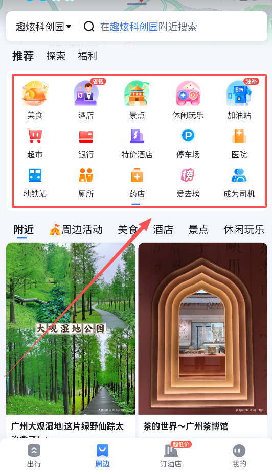 3、需要查找周边服务时,进入趣炫科创园或其他地点附近页面,这里有推荐、探索和福利分类。