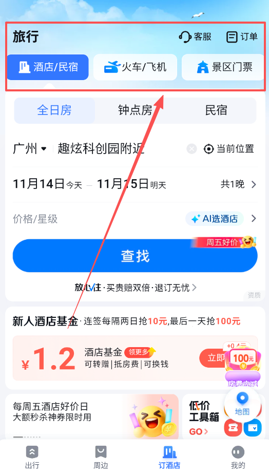 4、预订酒店时先进入旅行板块,选择酒店或民宿并设置日期与价格筛选,点击查找就能看到可选列表。