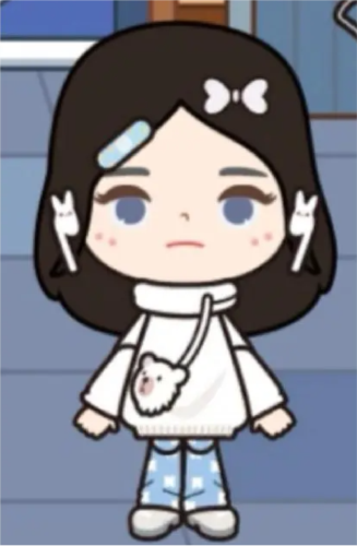 这个是白色的外穿毛衣+蓝色裤子+短靴,然后背上一个小熊挎包,适合出门逛街穿,但是比较适合天气有点冷,但不吹风的情况穿,因为吹风的时候毛衣可能会透风,就有点冷。整体是比较清新简约的,还有种时尚的感觉,很不错。