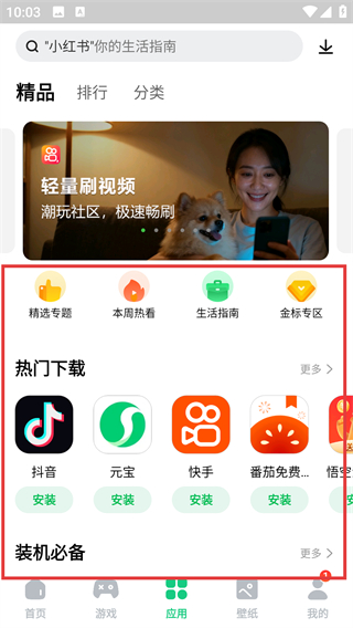 2、进入应用页面后找到【热门下载】板块,这里能看到当下热门的应用列表,方便挑选想安装的应用哦。