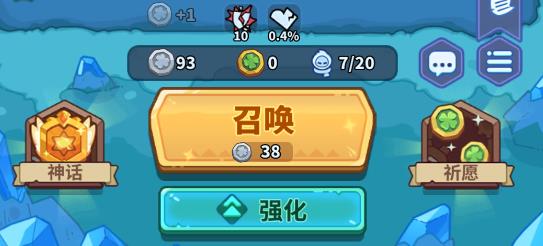 1、召唤:中间最大的按钮,点击「召唤」可以在场上获得普通(白)、精英(蓝)、稀有(紫)、传说(金)品质的英雄。每次召唤获得的英雄是随机的,获得3个相同的英雄可合成1个进阶英雄,如:3个白英雄可合成1个蓝英雄,合成获得什么英雄也是随机的。