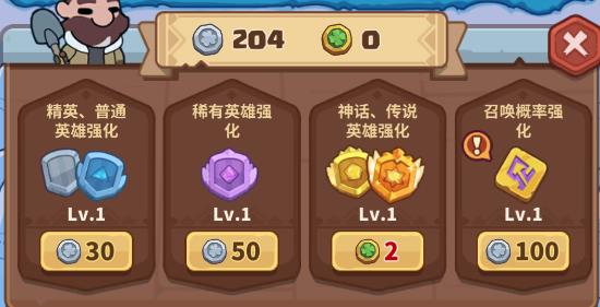 4、强化:上方提到的「召唤」,其概率受到下方「强化概率强化」影响,一般在保证能对敌的情况下优先升级召唤概率强化,满级为12级,需要1100银币。精英、普通英雄&稀有英雄强化一般情况下不升,在对敌有困难时适当升级。神话、传说英雄强化是主要需要升级的,也是局内后期主要战力来源之一,这个升级需要消耗幸运币,等级上限未知。