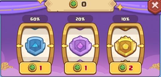 3、右侧的「祈愿」可以通过消耗幸运币概率召唤蓝色、紫色、金色英雄,初始概率和消耗如图。由于局内幸运币比较稀缺,花费幸运币进行召唤需要仔细权衡,建议关键卡一直不来且很急的时候可以搏一搏,或是主用鳄霸,终结者,凛冬之心,剑灵的玩家在打难度高的本时,可以花2个币,尝试博一下前置传说。