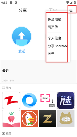 3、点右上角的菜单按钮,能展开功能列表,选【传至电脑】选项就能进入连接电脑的设置页哦。