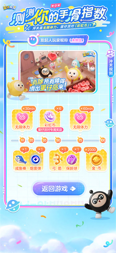 每百关即可获得一次无限体力30分钟。冲关奖励再加码,每百关还可获得一次抽奖机会,超级大奖Switch等着你!还有京东卡、蛋仔派对官方周边等超多惊喜!
