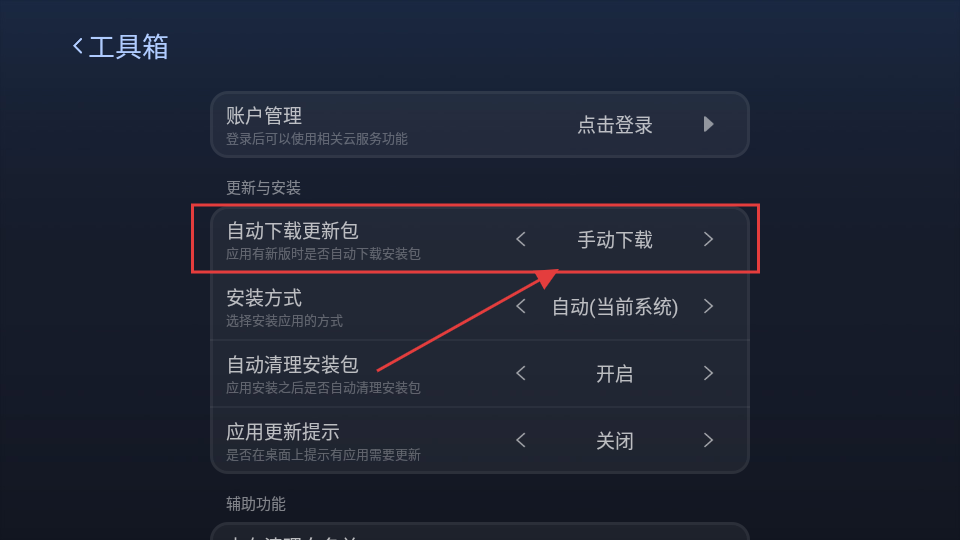 3、在设置页面,找到【自动下载更新包】选项,点击可进入其设置页面啦。