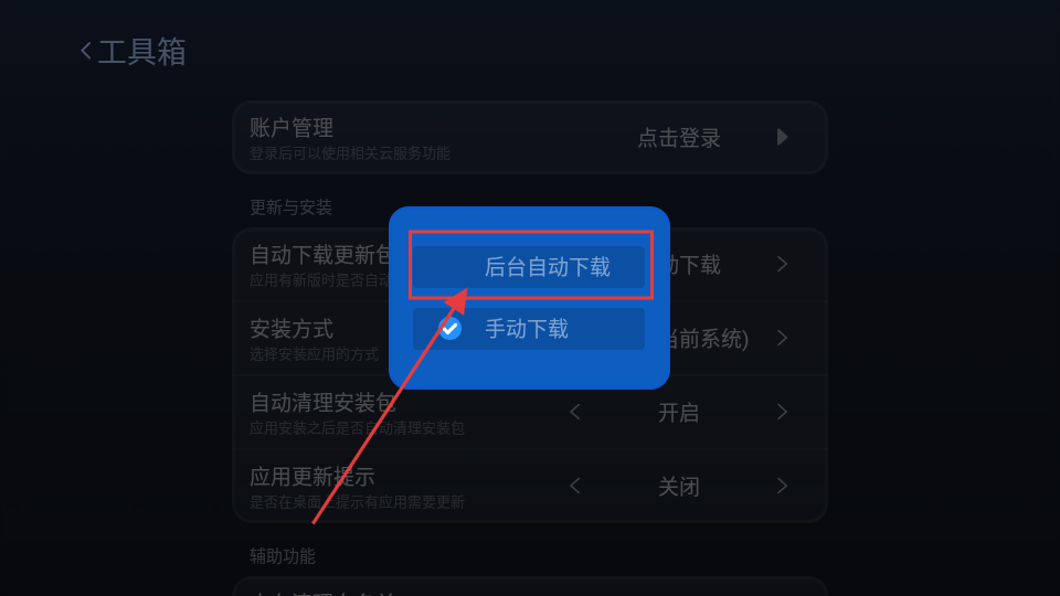 4、在自动下载更新包设置页面,可选择【后台自动下载】,让应用更新包后台自动下载哦。