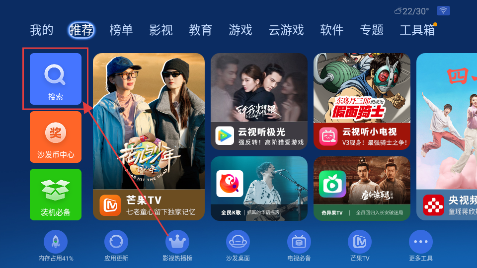 1、在主界面点击【搜索】按钮,进入搜索页面可查找想要的应用或影视哦。