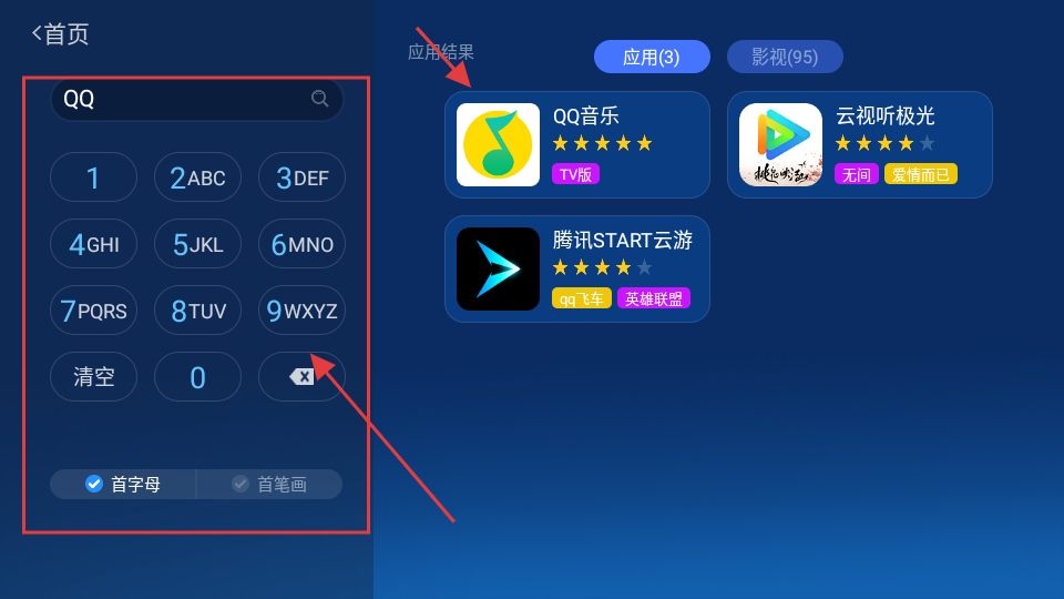 2、在搜索页面输入“QQ”,就能看到相关应用结果,比如【QQ音乐】【云视听极光】等啦。