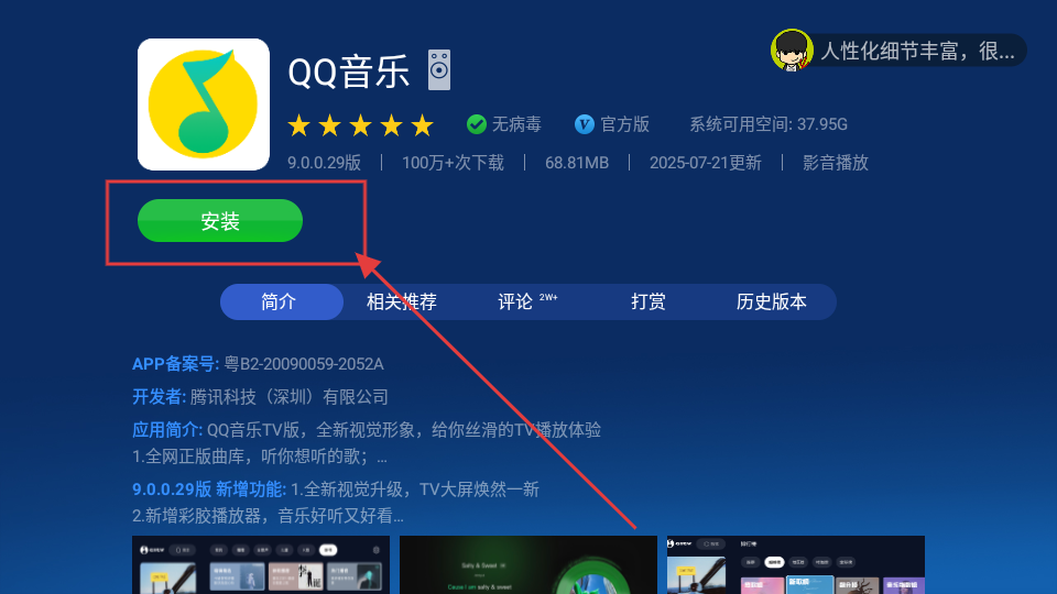4、下载完成后,点击【安装】按钮,就能安装【QQ音乐】应用啦。