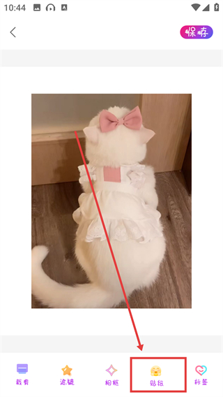 2、进入图片美化页后,点底部的【贴纸】选项,就能打开贴纸选择面板,给图片加装饰元素哦。