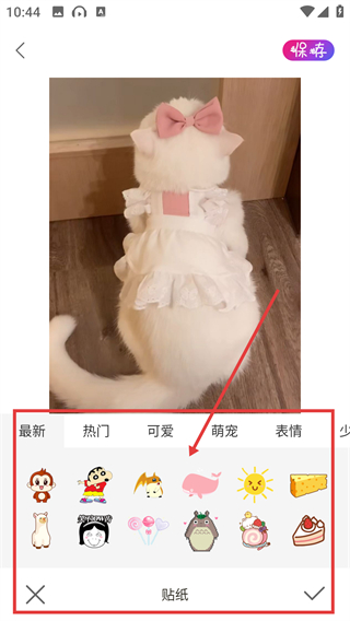 3、在贴纸面板里选喜欢的分类,比如【萌宠】类贴纸,就能挑对应的装饰图案添加到图片啦。