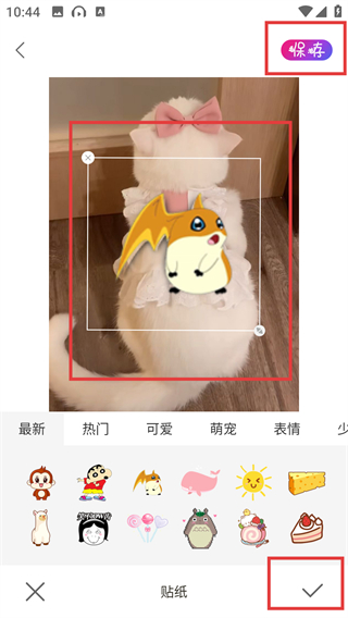 4、选好贴纸添加到图片后,调整位置再点确认按钮,最后点【保存】就能完成美化后的图片导出哦。