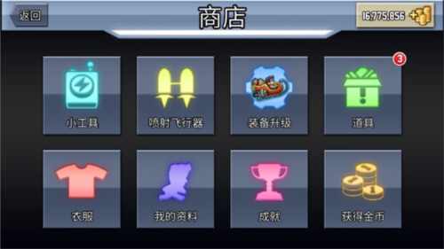 4、在商场中还能看见小工具、喷射飞行器,装备升级,道具,衣服等相关选项,依据自己的喜欢进行购买升级,从而让你的飞行人生更加舒畅。