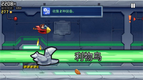 2、轻触任何位置开始游戏,点击屏幕人物就会往上飞,当不点屏幕就会降下,依据金币和道具的位置来进行调节,游戏而类似于像素鸟的玩法,但还加入了射击功能。期间遇到有电流的障碍,需要躲避,不能出碰,不然游戏GG。