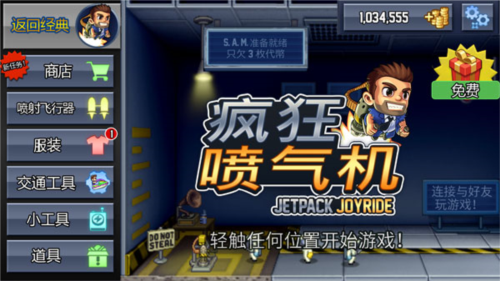 1、进入疯狂喷气机游戏的主界面,先点击右侧面,打开任务,以任务为目标去完成,接着在右侧面,点击打开仓库,可以更换衣服,装上更强的喷射器,对装备升级,在游戏里获得的金币,解锁实用道具和小工具,在游戏里更快的胜利。