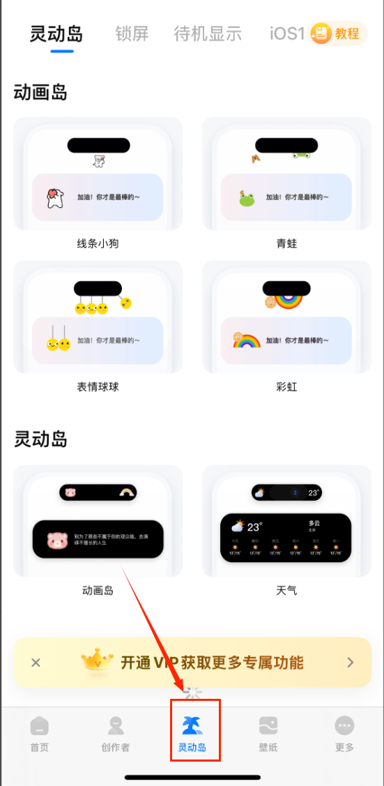 1、在"灵动岛"页面可以选择各种可爱的动画形象,比如线条小狗、青蛙等灵动岛样式,还能设置天气显示,让你的手机界面变得生动有趣。