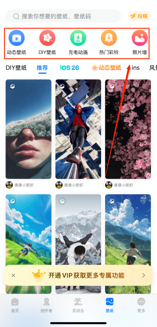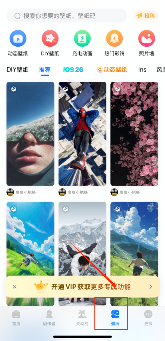 2、"壁纸"功能提供海量资源,可以按ins风、风景等分类浏览,或者直接搜索想要的壁纸,动态壁纸和DIY壁纸功能。