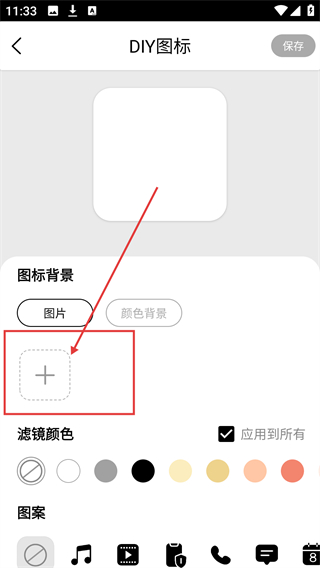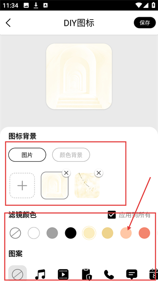 4、选好背景后,搭配【滤镜颜色】和图案,调整满意后点击保存,专属DIY图标就做好啦。