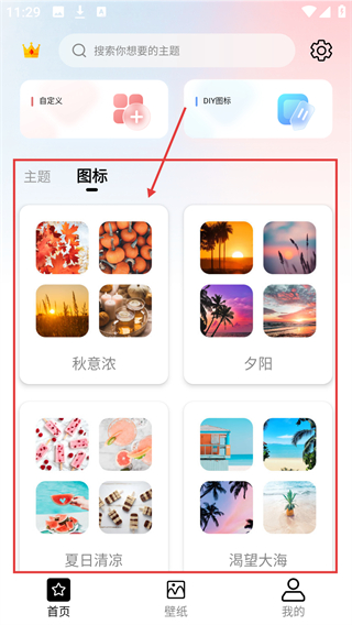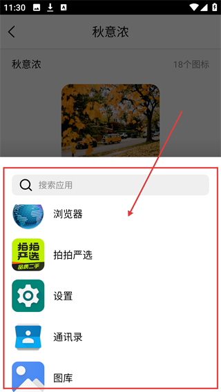 2、进入图标分类页后,选择心仪的图标套装(如【秋意浓】),点击即可进入该套装的详情界面哦。