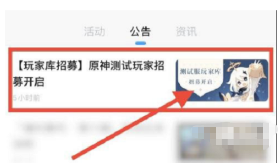 3、公告栏中,选择【原神测试玩家招募】,进入到指定的页面中。