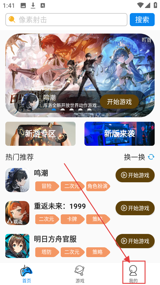 5、回到首页,中间有两个板块是“新游专区”和“新版来袭”;