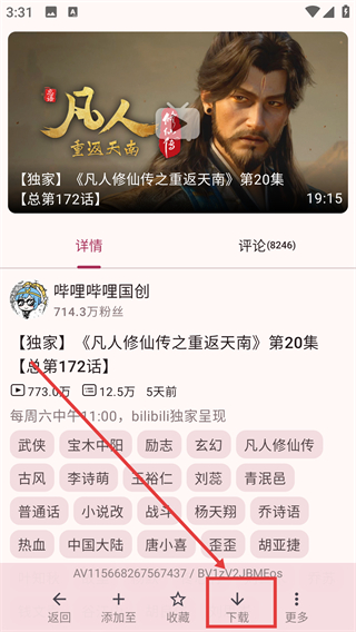 3、在动画详情页找到底部的【下载】按钮并点击,就能打开分P下载的选择界面,准备下载内容啦。