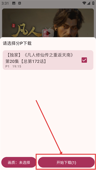 4、在分P下载界面选好要下载的集数后,点击【开始下载(1)】按钮,就能启动该集数的下载流程啦。