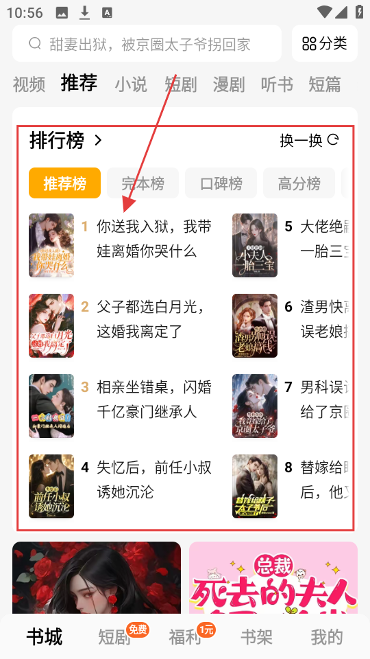 1、我们在排行榜的推荐榜里,选择感兴趣的小说,点击就能进入该书的详情页面啦。