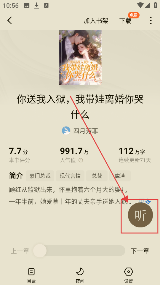 2、在该书详情页面,点击【听】按钮,就能进入智能朗读页面哦。