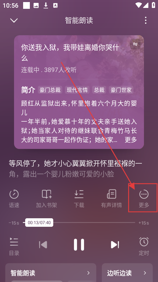 3、进入智能朗读页面后,点击【更多】按钮,就能展开更多听书设置选项呢。