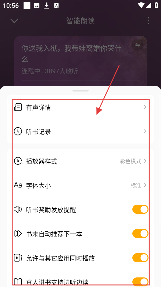 4、展开更多听书设置选项后,可对有声详情、听书记录、播放器样式等进行设置,设置后听书体验会更舒适啦。