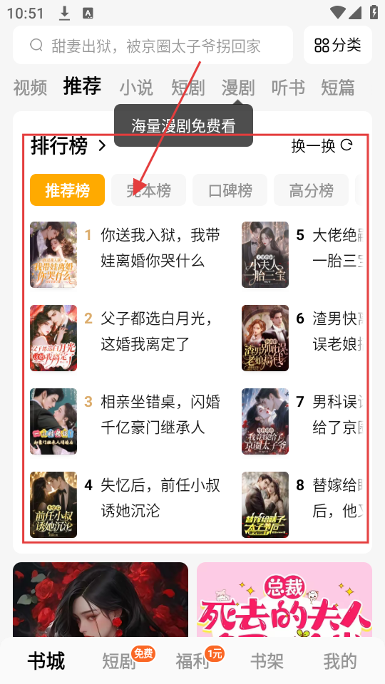 1、打开APP,在排行榜中找到目标小说,比如【你送我入狱,我带娃离婚你哭什么】,点击进入小说详情页啦。