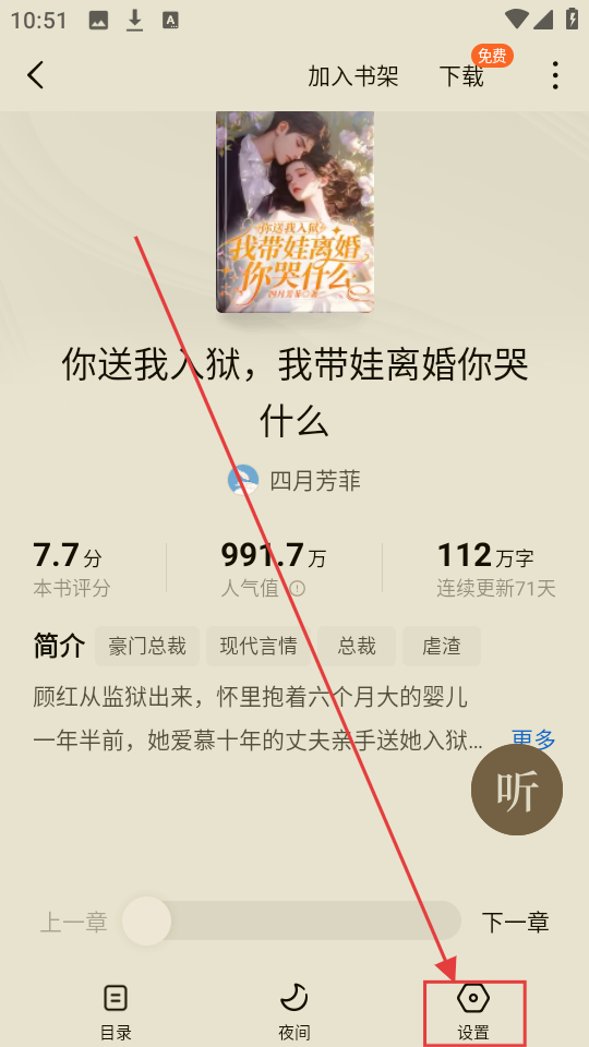 2、在小说详情页,点击右下角【设置】按钮,进入设置页面,找到字体相关选项哦。