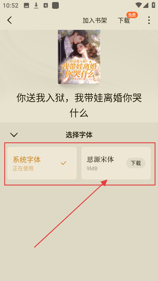 4、在字体选择页面,选择想要的字体,比如【思源宋体】,点击下载后即可使用该字体阅读小说,优化阅读体验啦。