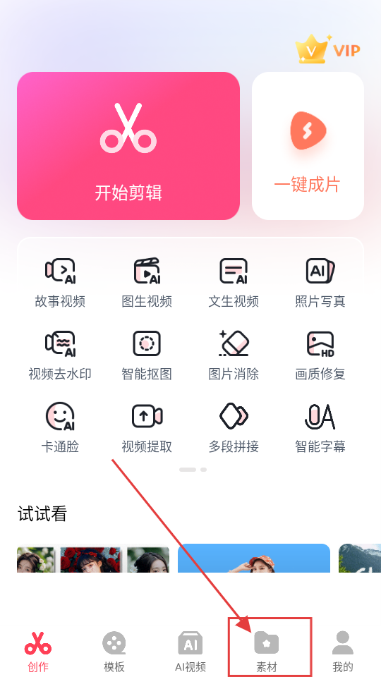 1、创作页面功能超丰富,有故事视频、图生视频等,要找素材,点底部【素材】,就能进入素材页面啦。