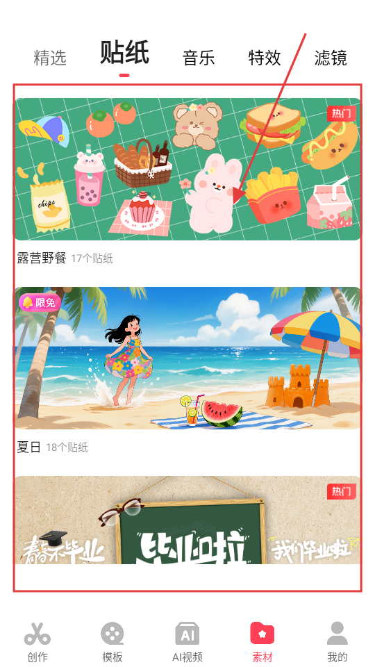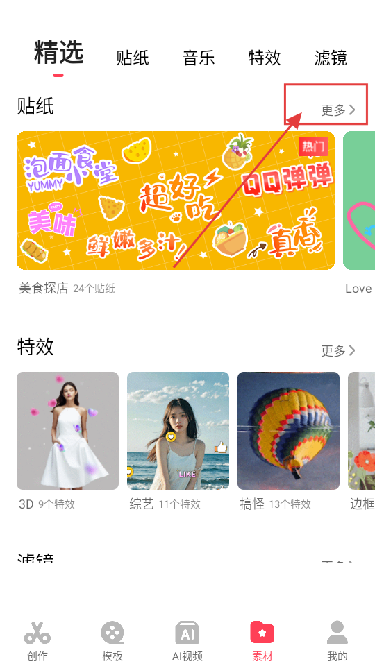 2、素材页面有精选、贴纸等分类,贴纸类想找更多,点【更多】,就能看到超多贴纸啦。