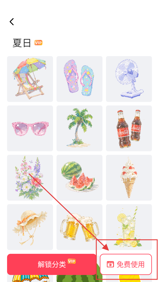 4、进到夏日贴纸页面,有遮阳伞、西瓜等贴纸,选好喜欢的,点【免费使用】,就能用啦。